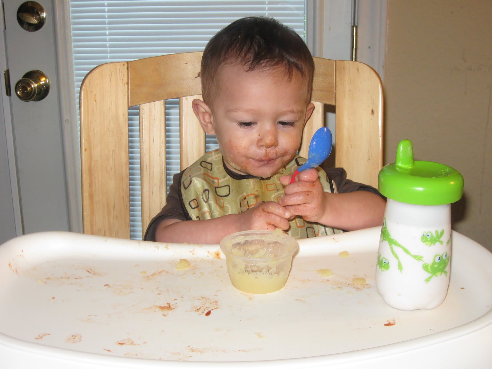 Recently we have begun to work with Parker on feeding himself. I have been told by many other mothers that this can take longer with boys to master than with girls. We have been taking it slow and allowing him to explore on his own with a spoon. I usually let him try it out when we are about to have a bath or have no where else to be since it can create quite the mess! He does not really like for us to feed him anymore and wants to do it on his own, so we try and help him by putting the food on the spoon and let him see if he can get it in his mouth. He is starting to get the hang of it but it is still a work in progress.